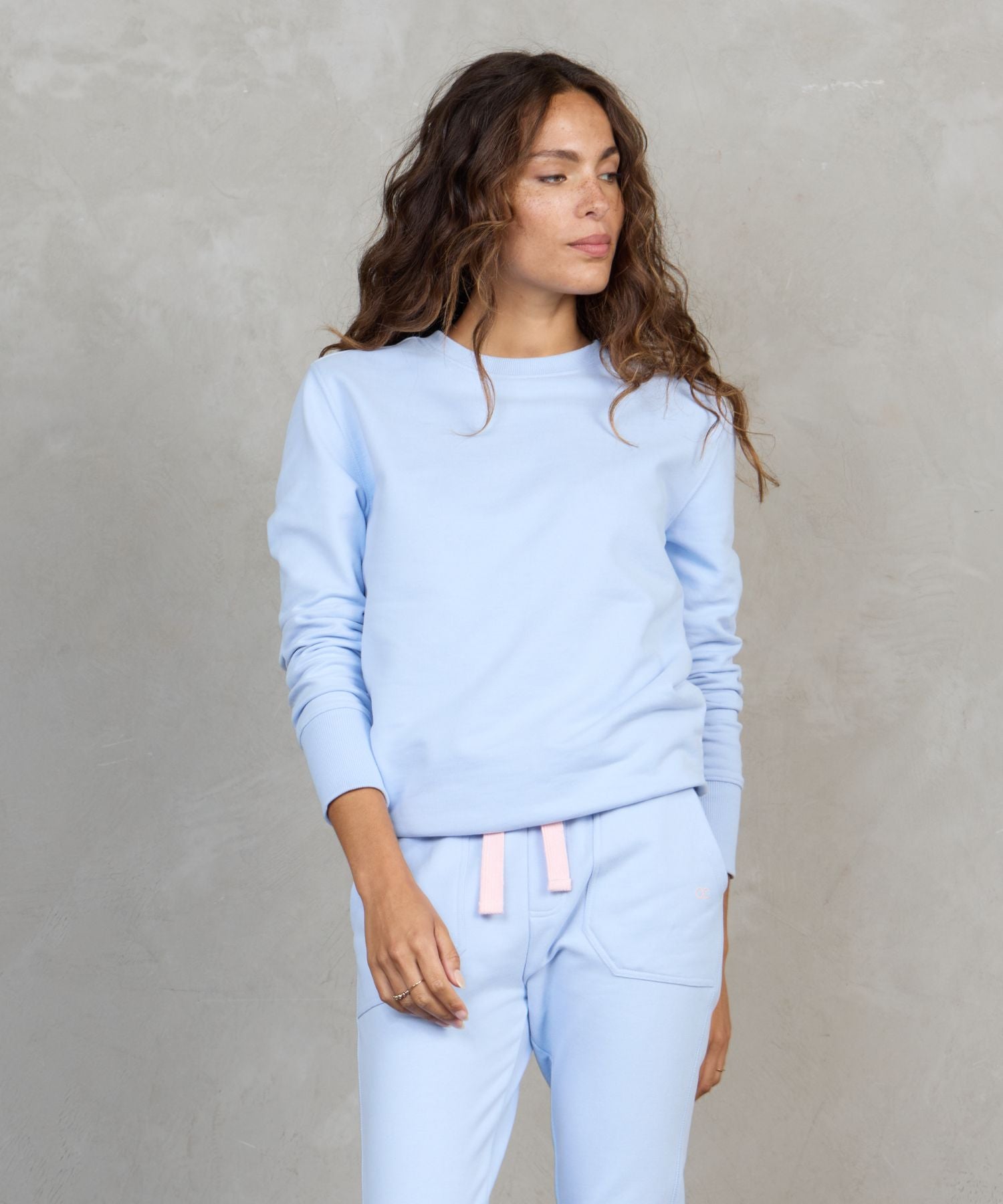 Make a statement in this trending Baby Blue loungewear combo. This outfit exudes relaxed, effortless style. Our lux touch Jogger features Pale Pink drawstrings and convenient deep pockets for your phone and accessories. Our matching sweater is a classic fit and finishes off this beautiful arrangement.